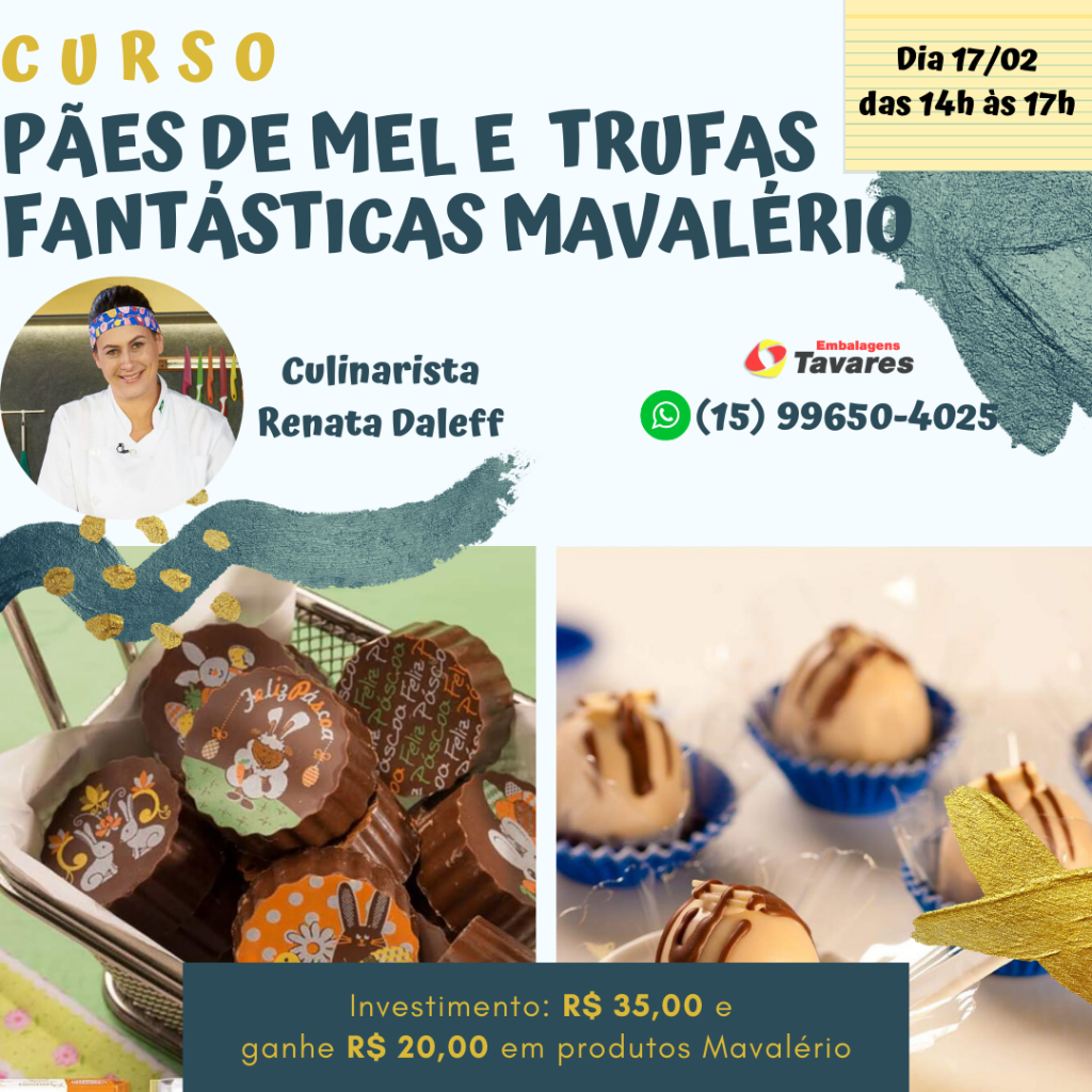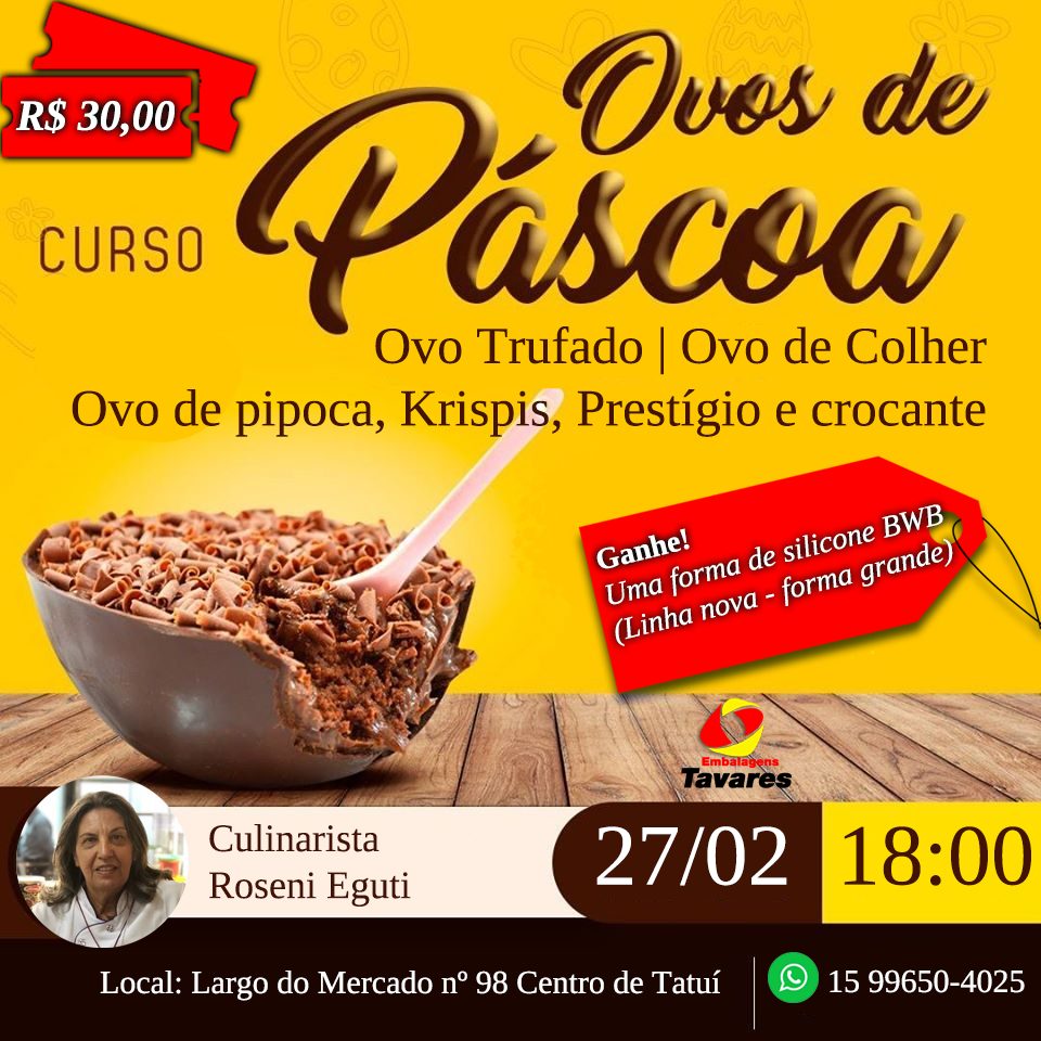 Clique aqui e faça a sua inscrição! Clique aqui e faça a sua inscrição! Venha participar dos nossos cursos e treinamentos.Chefs conceituadas e especializadas que vão te ensinar passo a passo todas as técnicas do mundo da culinária. "Amei o Curso Ovos de Páscoa da Sicao." Adriana Ferreira Confeiteira "A Embalagens Tavares sempre trazendo cursos extraordinários para nós." Fernanda Souza Confeiteira